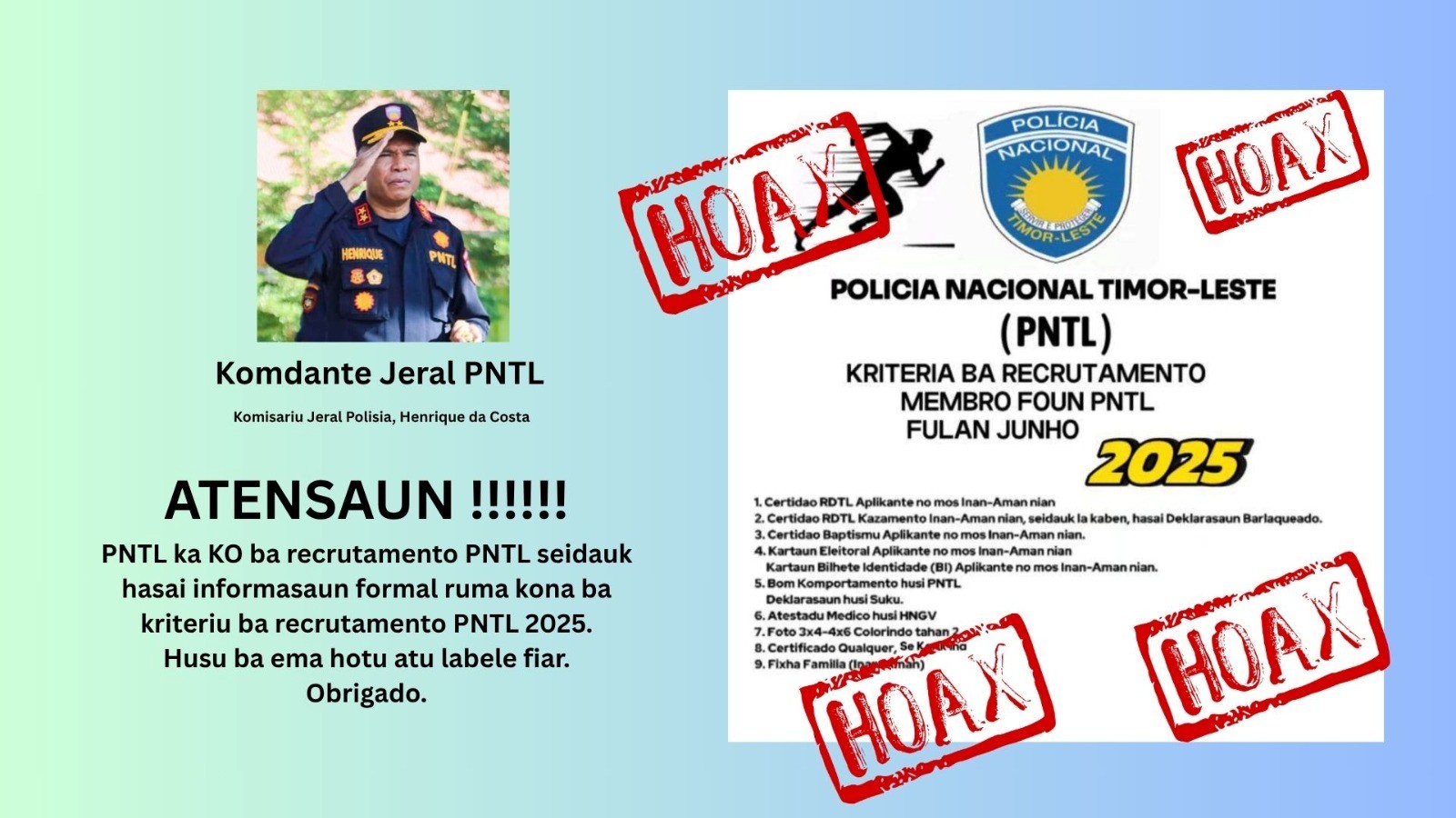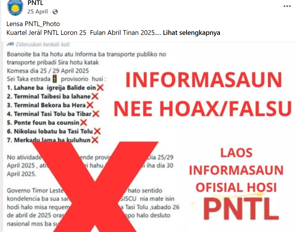 Em abril de 2025, espalhou-se também uma informação sobre medidas policiais para bloquear ruas públicas, relacionada com o falecimento do Santo Padre Papa Francisco (https://www.facebook.com/share/p/19Y6DBdfW6/), informação que a PNTL esclareceu através do programa Tatoli (https://www.facebook.com/TATOLI.IP/videos/2723525954506873/?rdid=ojindBNa7SHgTT4A#)