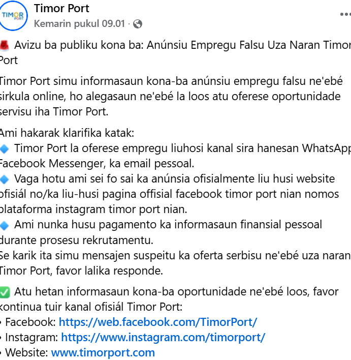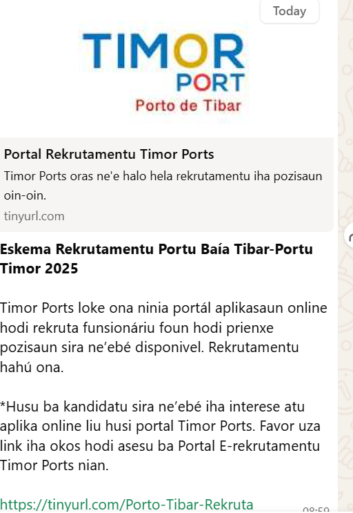 No decorrer de setembro de 2025, tornou-se viral uma informação falsa sobre um suposto esquema de recrutamento da Timor Port, antes de a Autoridade Portuária de Tibar fornecer o esclarecimento oficial (https://www.facebook.com/share/p/1CyJbzb5D6/). Muitas pessoas já tinham partilhado esta informação nas redes sociais e outras provavelmente acederam ao link e acreditaram no conteúdo antes do esclarecimento.